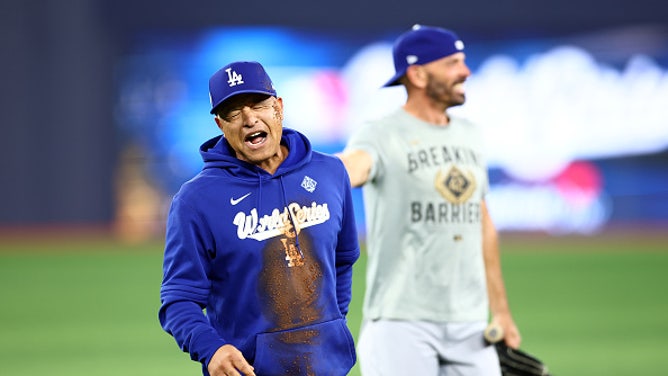 TORONTO, ON - OCTOBER 30: Manager Dave Roberts of the Los Angeles Dodgers reacts after falling on the ground between second and third base while having a running race with Hyeseong Kim #6 during a workout day ahead of game six of the 2025 World Series at Rogers Centre on October 30, 2025 in Toronto, Ontario, Canada. (Photo by Vaughn Ridley/Getty Images)