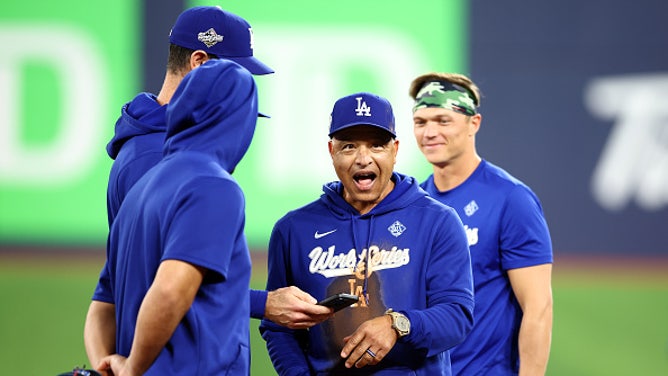 TORONTO, ON - OCTOBER 30: Manager Dave Roberts of the Los Angeles Dodgers speaks to players during a workout day ahead of game six of the 2025 World Series at Rogers Centre on October 30, 2025 in Toronto, Ontario, Canada. (Photo by Vaughn Ridley/Getty Images)