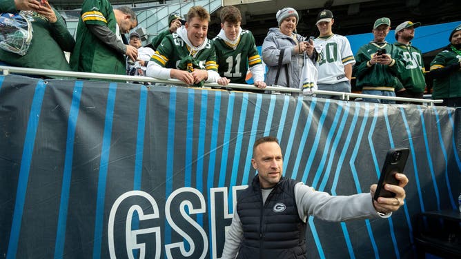 Nov 17, 2024; Chicago, Illinois, USA; Green Bay Packers defensive coordinator Jeff Hafley does a selfie with fans before their game against the Chicago Bears Sunday, November 17, 2024 at Solider Field in Chicago, Illinois. Mandatory Credit: Mark Hoffman/USA TODAY Network via Imagn Images