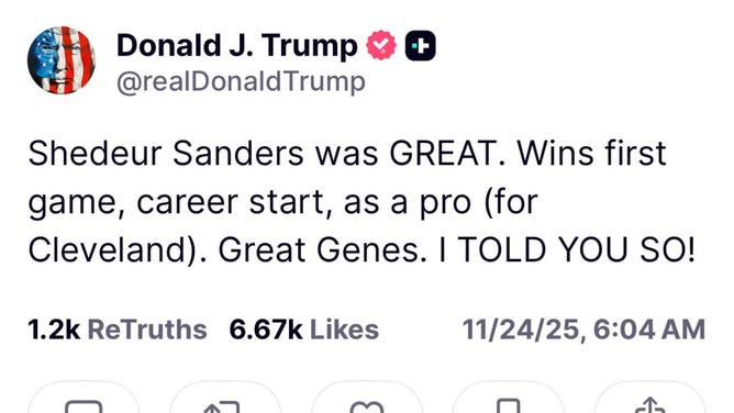 "Shedeur Sanders was GREAT," Trump trumpeted. "Wins first game, career start, as a pro (for Cleveland). Great Genes.