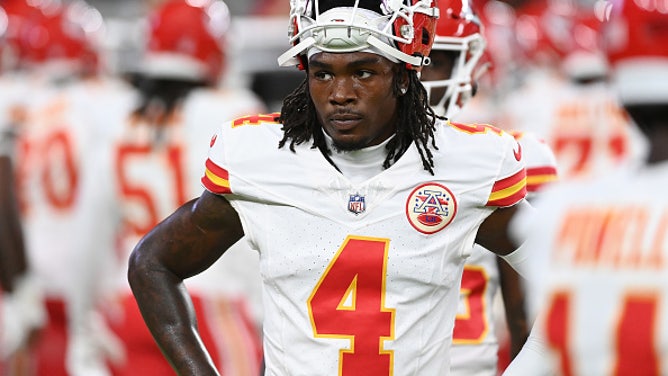 GLENDALE, ARIZONA - AUGUST 19: Rashee Rice #4 of the Kansas City Chiefs prepares for a preseason game against the Arizona Cardinals at State Farm Stadium on August 19, 2023 in Glendale, Arizona. (Photo by Norm Hall/Getty Images)
