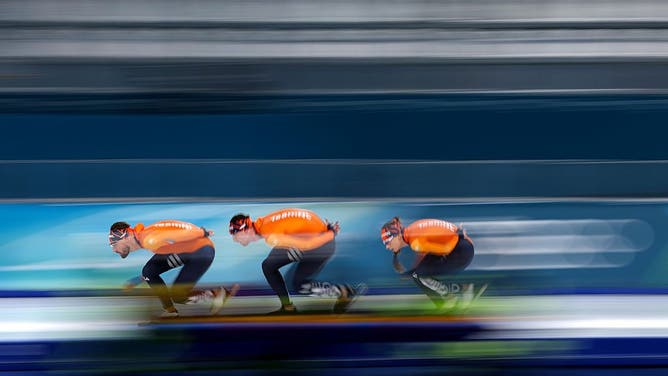 (L-R) Kjeld Nuis, Jenning de Boo and Femke Kok of Team Netherlands skate during training on day minus two of the Milano Cortina 2026 Winter Olympic Games at Milano Speed Skating Stadium on February 4, 2026 in Milan, Italy. (Photo by Dean Mouhtaropoulos/Getty Images)