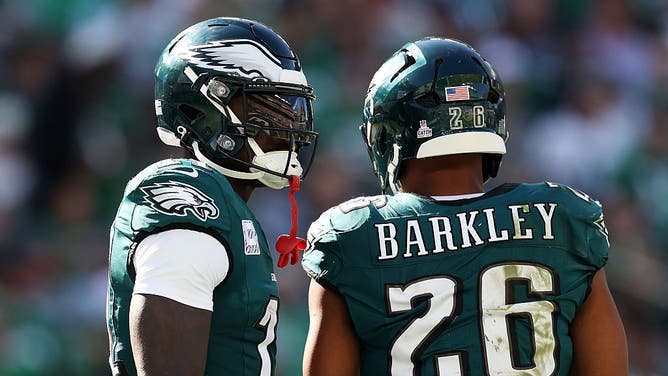 PHILADELPHIA, PENNSYLVANIA - OCTOBER 05: A.J. Brown #11 and Saquon Barkley #26 of the Philadelphia Eagles chat during the third quarter against the Denver Broncos in the game at Lincoln Financial Field on October 05, 2025 in Philadelphia, Pennsylvania. (Photo by Emilee Chinn/Getty Images)