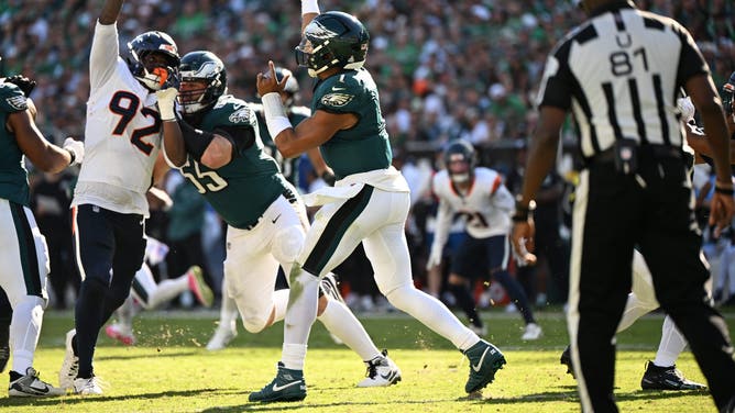 Oct 5, 2025; Philadelphia, Pennsylvania, USA; Philadelphia Eagles quarterback Jalen Hurts (1) throws against the Denver Broncos in the second half at Lincoln Financial Field. Mandatory Credit: Eric Hartline-Imagn Images