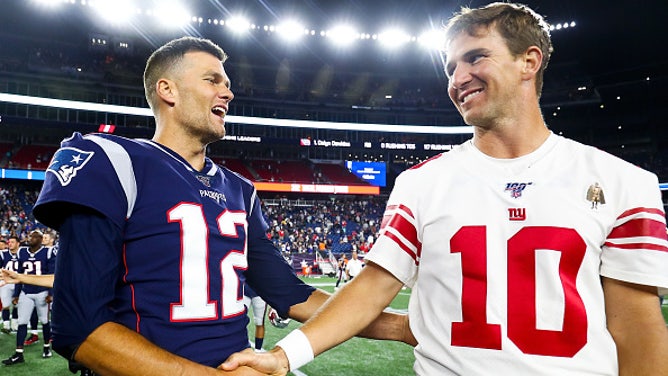 Tom Brady of the New England Patriots greets Eli Manning. (Photo by Adam Glanzman/Getty Images)