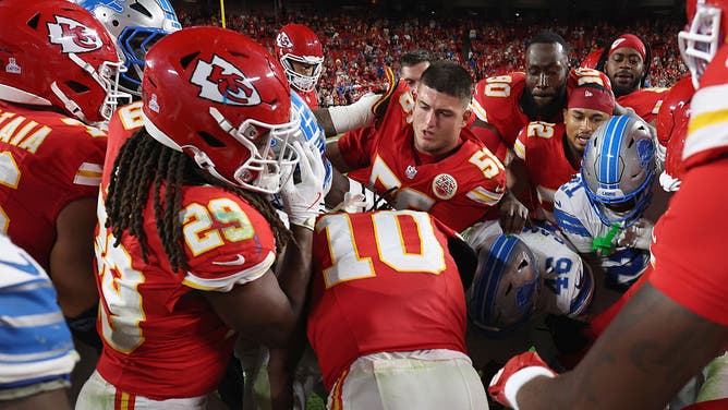 KANSAS CITY, MISSOURI - OCTOBER 12: The Kansas City Chiefs and the Detroit Lions fight after the game at Arrowhead Stadium on October 12, 2025 in Kansas City, Missouri. (Photo by Jamie Squire/Getty Images)