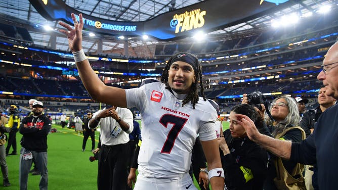 INGLEWOOD, Calif. - Houston Texans quarterback C.J. Stroud waves to fans following a game against the Los Angeles Chargers at SoFi Stadium on Dec. 27, 2025. Photo: Gary A. Vasquez-Imagn Images
