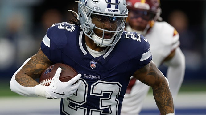 ARLINGTON, TEXAS - JANUARY 05: Rico Dowdle #23 of the Dallas Cowboys runs the ball against the Washington Commanders during the first quarter at AT&T Stadium on January 05, 2025 in Arlington, Texas. (Photo by Ron Jenkins/Getty Images)