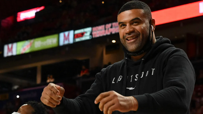 <strong>Shawne Merriman, former NFL and Maryland Terrapins linebacker, is recognized on the court for his charity Lights On Foundation's during the game against the George Washington Colonials at Xfinity Center on Nov. 11, 2021. (Tommy Gilligan/USA Today Sports)</strong>