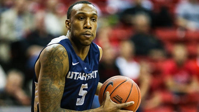 13 March 2014 : Utah State Aggies center Jarred Shaw (5) during the game between Utah State Aggies and San Diego State Aztecs in the quarter finals of the Mountain West Conference tournament at the Thomas & Mack Center in Las Vegas, Nevada. (Photo by Steve Conner/Icon SMI/Corbis/Icon Sportswire via Getty Images)