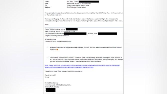 "We recently had two of our women’s swimmers speak out regarding Lia Thomas winning the 500m freestyle at NCAA’s," Gilbert-Lowry wrote. "I’m not sure if this will come up from our student-athletes in attendance … but wanted you and Heather to be aware. Here is a link to an article about their comments …"