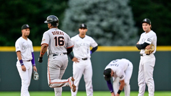 DENVER - San Francisco Giants designated hitter Rafael Devers runs past the Colorado Rockies infielders after an on-field incident following his first inning two-run home run during a game between the San Francisco Giants and the Colorado Rockies at Coors Field on September 2, 2025. (Photo by Dustin Bradford/Icon Sportswire via Getty Images)