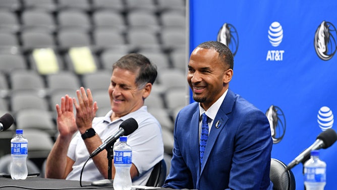 DALLAS - Mark Cuban and General Manager Nico Harrison address the media during the Dallas Mavericks Jason Kidd Press Conference on July 15, 2021 at the American Airlines Center. (Photo by Glenn James/NBAE via Getty Images)