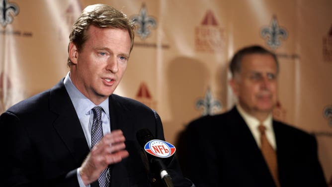 Sep 25, 2006; New Orleans, LA, USA; NFL commissioner Roger Goodell speaks at a press conference as former commissioner Paul Tagliabue watches before a Monday Night Football game in the Louisiana Superdome. The game is the first event in the Superdome a year after it was heavily damaged by Hurricane Katrina and used as a shelter from the storm by tens of thousands of people. Mandatory Credit: Photo By John David Mercer-USA TODAY Sports Copyright © 2006 John David Mercer