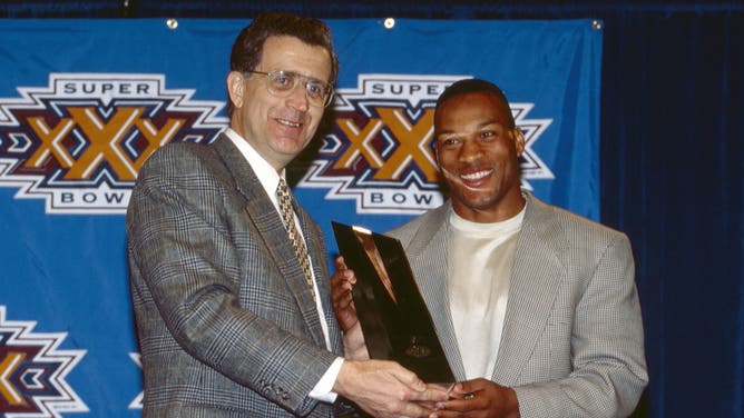 Jan 29, 1996; Tempe,AZ, USA; Dallas Cowboys cornerback Larry Brown accepts the MVP trophy from commissioner Paul Tagliabue a day after defeating the Pittsburgh Steelers in Super Bowl XXX at the Sun Devil Stadium. Dallas defeated Pittsburgh 27-17. Mandatory Credit: Matthew Emmons-USA TODAY Sports