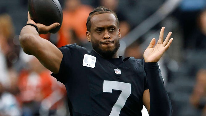 Las Vegas Raiders quarterback Geno Smith (7) throws a pass during a warm up before a game against the Cleveland Browns at Allegiant Stadium on Nov. 23, 2025, in Las Vegas. (Bizuayehu Tesfaye/Las Vegas Review-Journal/Tribune News Service via Getty Images)