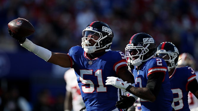 EAST RUTHERFORD, NEW JERSEY - NOVEMBER 02: Abdul Carter #51 of the New York Giants celebrates an interception against the San Francisco 49ers during the first half in the game at MetLife Stadium on November 02, 2025 in East Rutherford, New Jersey. (Photo by Al Bello/Getty Images)