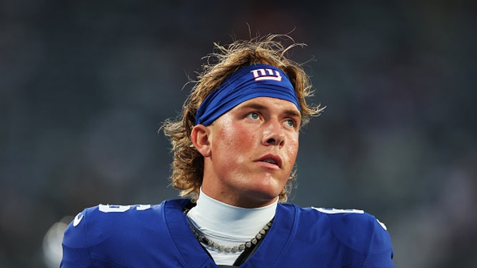 EAST RUTHERFORD, NJ - Jaxson Dart of the New York Giants looks on prior to the game against the New England Patriots during an NFL Preseason 2025 game at MetLife Stadium on August 21, 2025. (Photo by Al Bello/Getty Images)