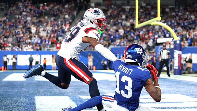 EAST RUTHERFORD, NJ - Jalin Hyatt #13 of the New York Giants catches a touchdown pass while being defended by Kobee Minor #19 of the New England Patriots during the first half of a NFL Preseason 2025 game between New England Patriots and New York Giants at MetLife Stadium on August 21, 2025. (Photo by Ishika Samant/Getty Images)