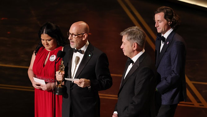 HOLLYWOOD, CALIFORNIA - MARCH 15: (L-R) Gloria Cazares, Joshua Seftel, Steve Hartman, and Conall Jones accept the Documentary Short Film award for "All the Empty Rooms" onstage during the 98th Oscars at Dolby Theatre on March 15, 2026 in Hollywood, California. (Photo by Kevin Winter/Getty Images)