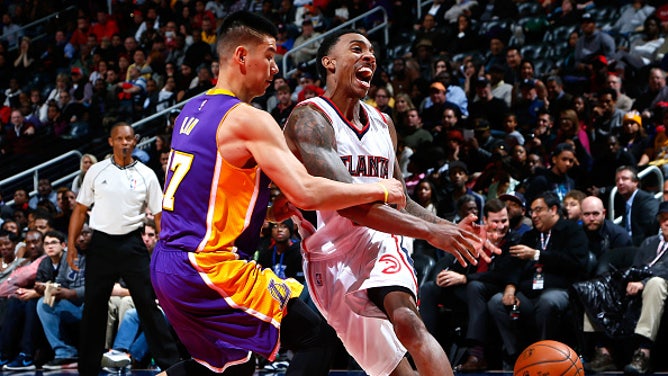 ATLANTA, GA - NOVEMBER 18: Jeremy Lin #17 of the Los Angeles Lakers fouls Jeff Teague #0 of the Atlanta Hawks at Philips Arena on November 18, 2014 in Atlanta, Georgia. (Photo by Kevin C. Cox/Getty Images)
