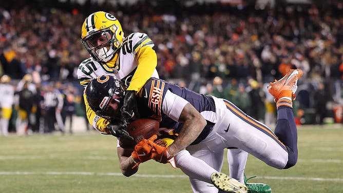 CHICAGO, ILLINOIS - DECEMBER 20: DJ Moore #2 of the Chicago Bears catches a touchdown pass against Keisean Nixon #25 of the Green Bay Packers during overtime at Soldier Field on December 20, 2025 in Chicago, Illinois. (Photo by Michael Reaves/Getty Images)