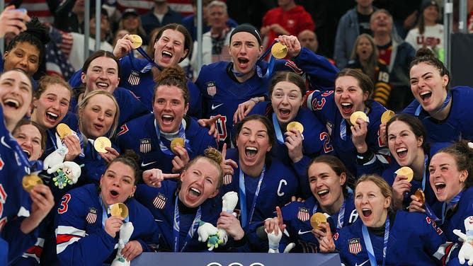Gold medalist Team United States pose after the medal ceremony for the Ice Hockey Women following the Women's Gold Medal match between the United States and Canada.