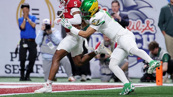 ATLANTA - D'Angelo Ponds of the Indiana Hoosiers scores a touchdown on an interception against Dante Moore of the Oregon Ducks during the first quarter in the 2025 College Football Playoff Semifinal at the Chick-fil-A Peach Bowl at Mercedes-Benz Stadium on January 9, 2026. (Photo by Jonathan Bachman/Getty Images)