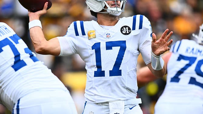PITTSBURGH, PENNSYLVANIA - NOVEMBER 02: Daniel Jones #17 of the Indianapolis Colts passes against the New England Patriots during the first half in the game at Acrisure Stadium on November 02, 2025 in Pittsburgh, Pennsylvania. (Photo by Joe Sargent/Getty Images)
