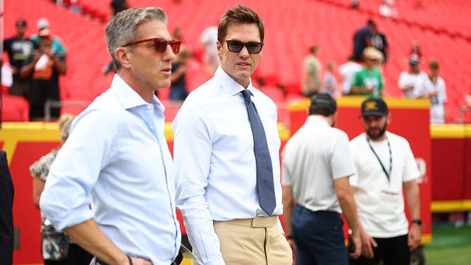 KANSAS CITY, MISSOURI - SEPTEMBER 14: Fox Sports commentators Kevin Burkhardt and Tom Brady look on prior to the game between the Philadelphia Eagles and Kansas City Chiefs at Arrowhead Stadium on September 14, 2025 in Kansas City, Missouri. (Photo by Kevin Sabitus/Getty Images)