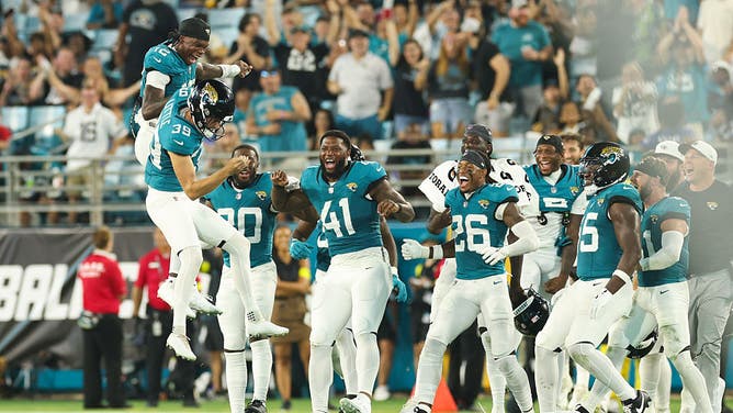 Travis Hunter and the Jacksonville Jaguars celebrate with Cam Little after the kicker's 70-yard field goal. (Photo by Logan Bowles/Getty Images)