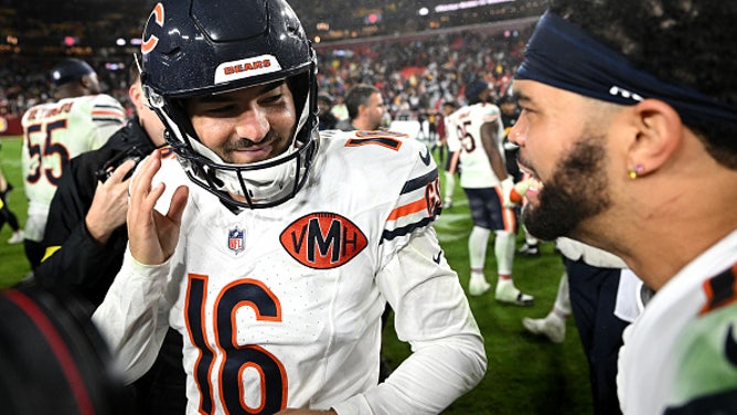 LANDOVER, MARYLAND - OCTOBER 13: Jake Moody #16 celebrates with Caleb Williams #18 of the Chicago Bears after the game against the Washington Commanders at Northwest Stadium on October 13, 2025 in Landover, Maryland. (Photo by Greg Fiume/Getty Images)