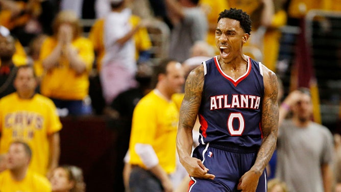 CLEVELAND, OH - MAY 24: Jeff Teague #0 of the Atlanta Hawks reacts in overtime against the Cleveland Cavaliers during Game Three of the Eastern Conference Finals of the 2015 NBA Playoffs at Quicken Loans Arena on May 24, 2015 in Cleveland, Ohio. (Photo by Gregory Shamus/Getty Images)