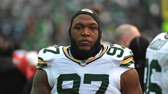 Jan 12, 2025; Philadelphia, Pennsylvania, USA; Green Bay Packers defensive tackle Kenny Clark (97) against the Philadelphia Eagles in an NFC wild card game at Lincoln Financial Field. Mandatory Credit: Eric Hartline-Imagn Images