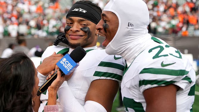 CINCINNATI, OHIO - OCTOBER 26: Justin Fields #7 and Azareye'h Thomas #23 of the New York Jets speak to the media after the game against the Cincinnati Bengals at Paycor Stadium on October 26, 2025 in Cincinnati, Ohio. (Photo by Dylan Buell/Getty Images)