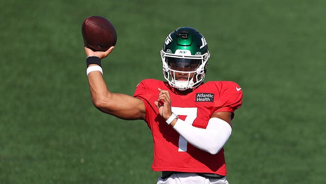 FLORHAM PARK, NEW JERSEY - JULY 28: Justin Fields #7 of the New York Jets practices during training camp at Atlantic Health Jets Training Center on July 28, 2025 in Florham Park, New Jersey. (Photo by Ishika Samant/Getty Images)