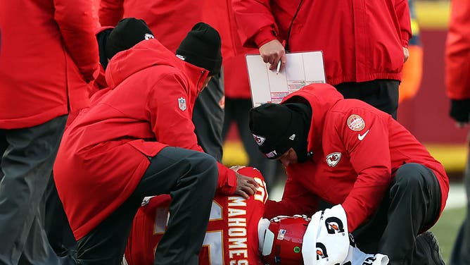 KANSAS CITY, MISSOURI - DECEMBER 14: Patrick Mahomes #15 of the Kansas City Chiefs lays on the ground after sustaining an injury during the fourth quarter against the Los Angeles Chargers at Arrowhead Stadium on December 14, 2025 in Kansas City, Missouri. (Photo by Jamie Squire/Getty Images)