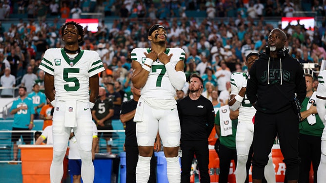 MIAMI GARDENS, FLORIDA - SEPTEMBER 29: Garrett Wilson #5, Justin Fields #7, and Head coach Aaron Glenn of the New York Jets stand on the sidelines during the national anthem prior to a NFL football game against the Miami Dolphins at Hard Rock Stadium on September 29, 2025 in Miami Gardens, Florida. (Photo by Logan Bowles/Getty Images)