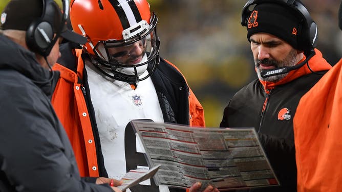 Baker Mayfield talks with head coach Kevin Stefanski of the Cleveland Browns during the game against the Pittsburgh Steelers at Heinz Field on January 3, 2022.