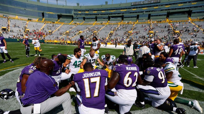 GREEN BAY, WI - Players kneel in prayer following a game between the Green Bay Packers and Baltimore Ravens on August 24, 2024 at Lambeau Field. (Photo by Larry Radloff/Icon Sportswire via Getty Images)