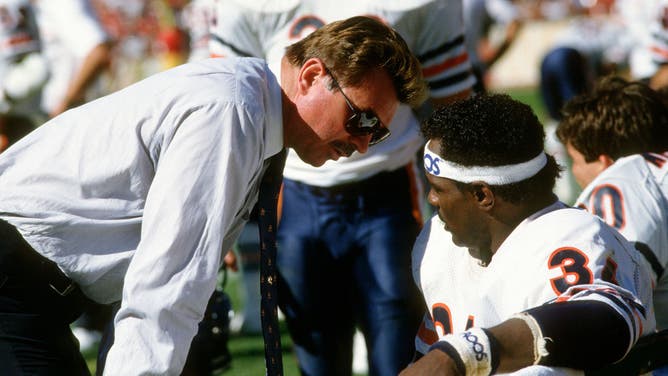 SAN FRANCISCO, CA - OCTOBER 13: Head Coach Mike Ditka of the Chicago Bears talks with his player Walter Payton #34 during an NFL football game against the San Francisco 49ers October 13, 1985 at Candlestick Park in San Francisco, California. Ditka was the head coach of the Bears from 1982-92. (Photo by Focus on Sport/Getty Images)