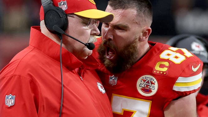 LAS VEGAS, NEVADA - FEBRUARY 11: Travis Kelce #87 of the Kansas City Chiefs reacts at Head coach Andy Reid in the first half against the San Francisco 49ers during Super Bowl LVIII at Allegiant Stadium on February 11, 2024 in Las Vegas, Nevada. (Photo by Jamie Squire/Getty Images)