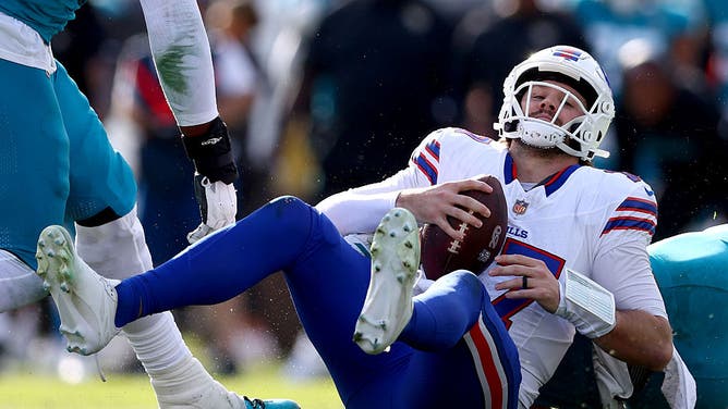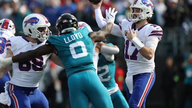 JACKSONVILLE, FLORIDA - JANUARY 11: Josh Hines-Allen #41 of the Jacksonville Jaguars sacks Josh Allen #17 of the Buffalo Bills during the third quarter in the AFC Wild Card Playoff game at EverBank Stadium on January 11, 2026 in Jacksonville, Florida. (Photo by Megan Briggs/Getty Images)