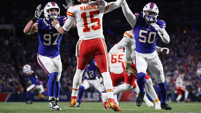 ORCHARD PARK, NEW YORK - NOVEMBER 02: Patrick Mahomes #15 of the Kansas City Chiefs throws as Joey Bosa #97 and Greg Rousseau #50 of the Buffalo Bills defend during the third quarter in the game at Highmark Stadium on November 02, 2025 in Orchard Park, New York. (Photo by Bryan M. Bennett/Getty Images)