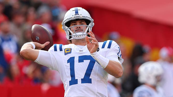 KANSAS CITY, MISSOURI - NOVEMBER 23: Daniel Jones #17 of the Indianapolis Colts warms up prior to the game against the Kansas City Chiefs at Arrowhead Stadium on November 23, 2025 in Kansas City, Missouri. (Photo by David Eulitt/Getty Images)
