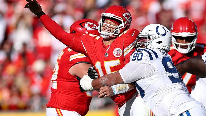 KANSAS CITY, MISSOURI - NOVEMBER 23: Patrick Mahomes #15 of the Kansas City Chiefs attempts a pass while under pressure from Adetomiwa Adebawore #95 of the Indianapolis Colts in the third quarter of the game at Arrowhead Stadium on November 23, 2025 in Kansas City, Missouri. (Photo by David Eulitt/Getty Images)