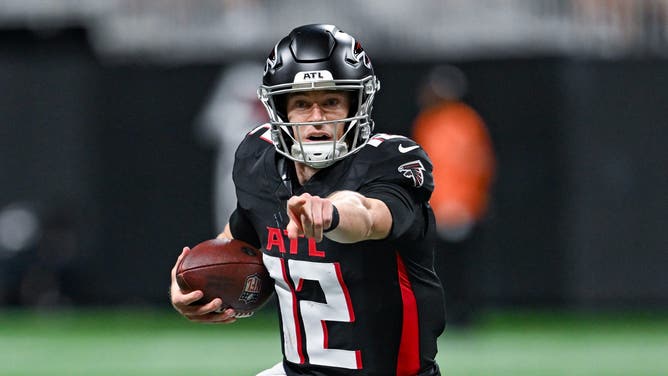 ATLANTA, GA AUGUST 15: Atlanta quarterback Easton Stick (12) gestures while running the ball during the NFL preseason game between the Tennessee Titans and the Atlanta Falcons on August 15th, 2025 at Mercedes-Benz Stadium in Atlanta, GA. (Photo by Rich von Biberstein/Icon Sportswire via Getty Images)