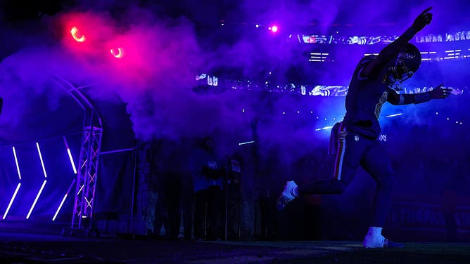 BALTIMORE, MARYLAND - NOVEMBER 27: Lamar Jackson #8 of the Baltimore Ravens runs onto the field during player introduction prior to the game against the Cincinnati Bengals at M&T Bank Stadium on November 27, 2025 in Baltimore, Maryland. (Photo by Ishika Samant/Getty Images)