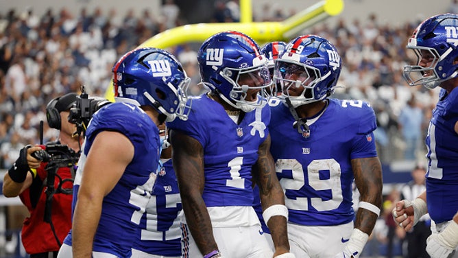 ARLINGTON, TEXAS - SEPTEMBER 14: Malik Nabers #1 of the New York Giants celebrates with teammates after scoring a touchdown in the second quarter of the game against the Dallas Cowboys at AT&T Stadium on September 14, 2025 in Arlington, Texas. (Photo by Ron Jenkins/Getty Images)