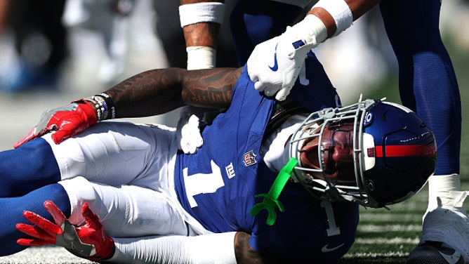 EAST RUTHERFORD, NEW JERSEY - SEPTEMBER 28: Malik Nabers #1 of the New York Giants reacts after being injured against the Los Angeles Chargers during the second quarter in the game at MetLife Stadium on September 28, 2025 in East Rutherford, New Jersey. (Photo by Ishika Samant/Getty Images)